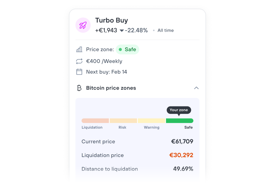 With Turbo each purchase provides up to 60% additional buying power compared to a standard spot purchase. Turbo Buy is designed to prevent users from falling into a negative account balance. Losses are limited to the capital allocated to the strategy.